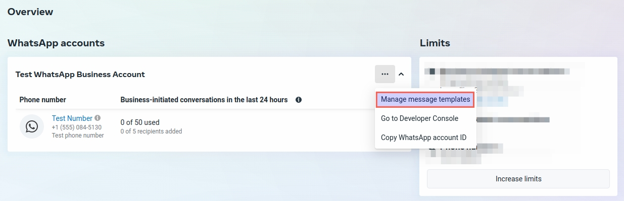 In the “Overview” section that appears next, click on the three dots on the right of the WhatsApp account you previously created, and then click on “Manage message templates“: