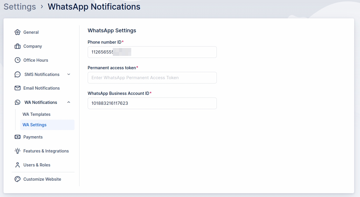 Now that you’ve configured the phone number for WhatsApp messaging, let’s proceed to copy this information into Appointr’s settings. As mentioned earlier, you’ll need to return to the Phone Number ID and WhatsApp Business Account ID after adding your number.