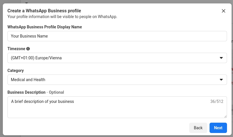 This will bring up a modal where you add your business name (this is the name your customers will see on WhatsApp when they receive a message from you), business email (needs to be a valid email, since you’ll need to confirm it), your country, and your business website.