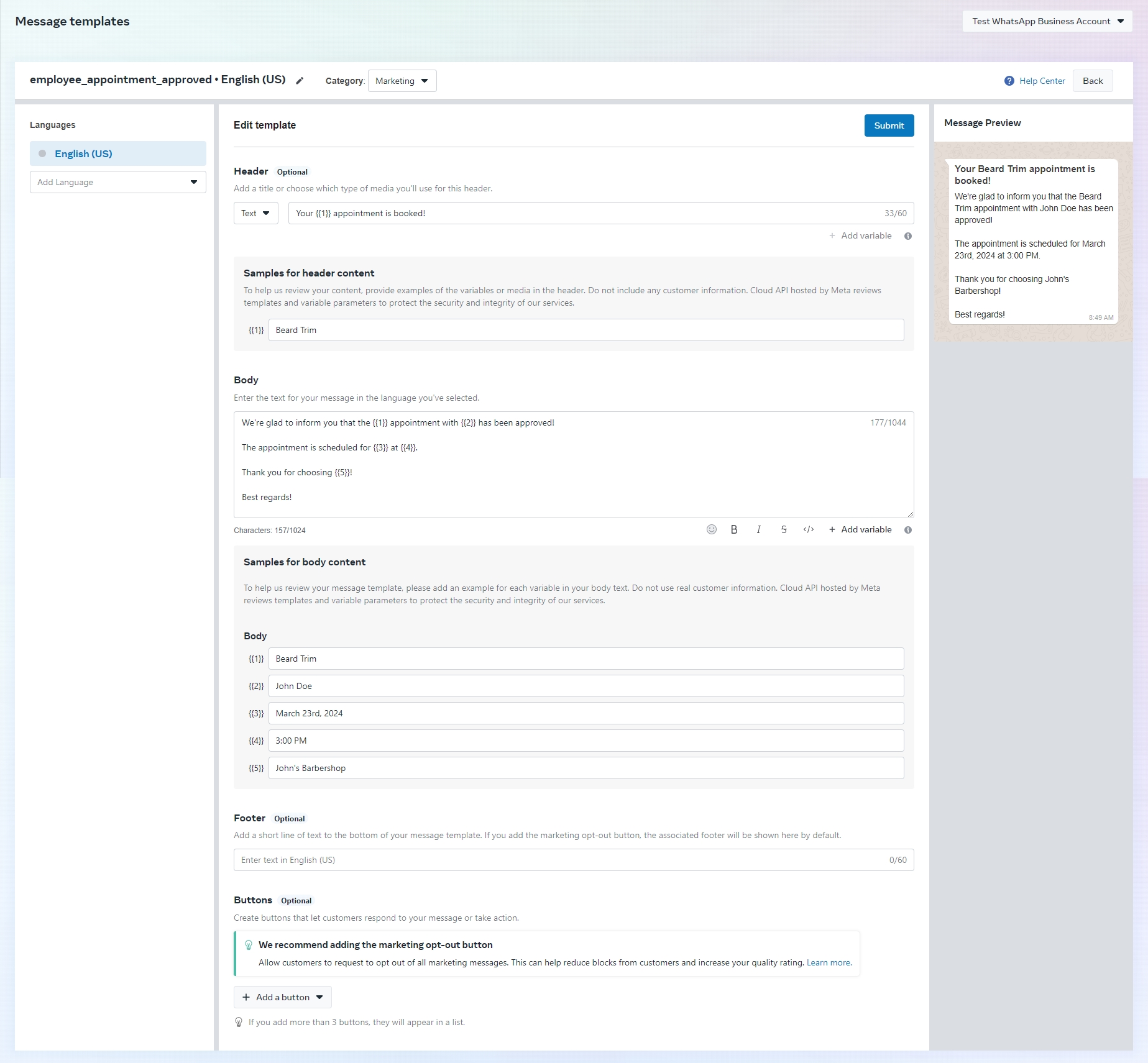 It’s crucial to understand which variable corresponds to which placeholder in Appointr. For instance, {{1}} in WhatsApp corresponds to {{service_name}} in Appointr.