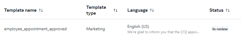 The primary distinction is the configuration of variables (placeholders) in the template, which can only be numerical. As illustrated in the screenshot below, these placeholders are formatted as {{1}}, {{2}}, and so forth, resembling Appointr’s placeholders enclosed in double curly brackets.