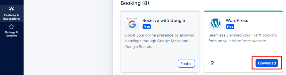 In order to install the “Appointr” WordPress plugin, you need to access Features & Integrations and locate the WordPress integration. Click on the “Download” button and the “booking-system-appointr.zip” file will be downloaded to your computer.