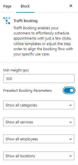 On the far right, in the side menu, you can enable the “Preselect Booking Parameters” slider where you can filter what the form will show on the front end – if it’s going to show only one Category or all Categories; if it’s going to show only one Service or all Services; if it’s going to show only one Employee or all employees, and if it’s going to show only one Location or all locations.