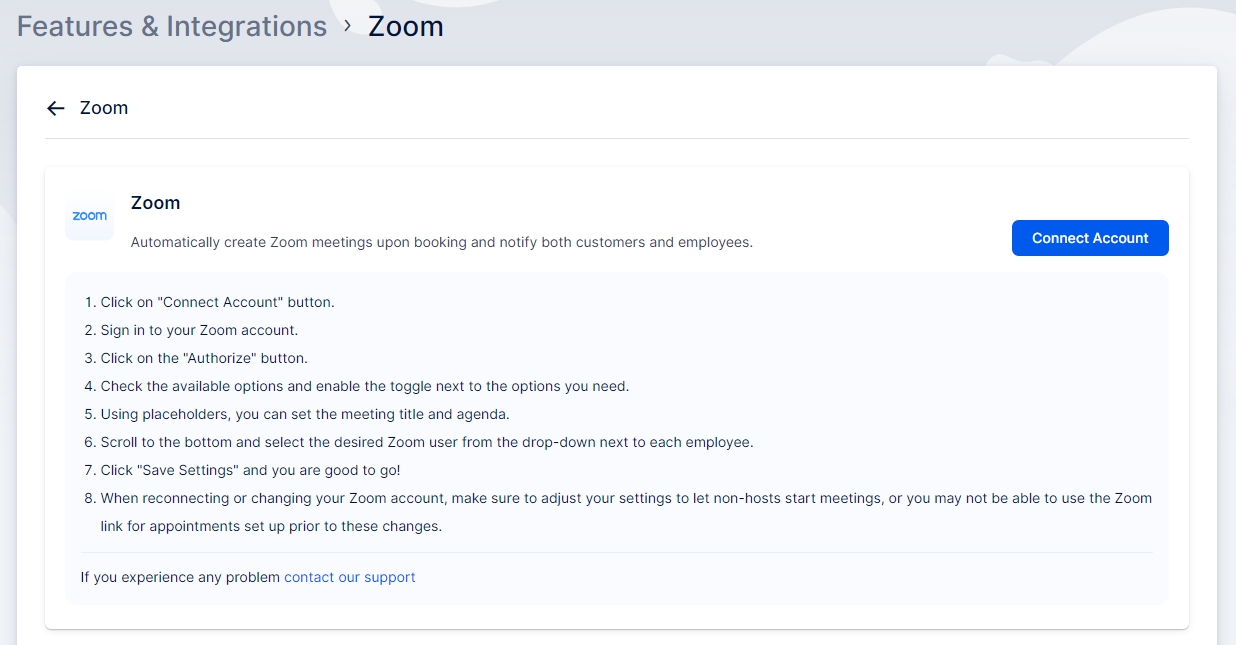 Next, a new page will open with instructions on how to link your Zoom account. Start by clicking “Connect Account” to initiate the setup process.