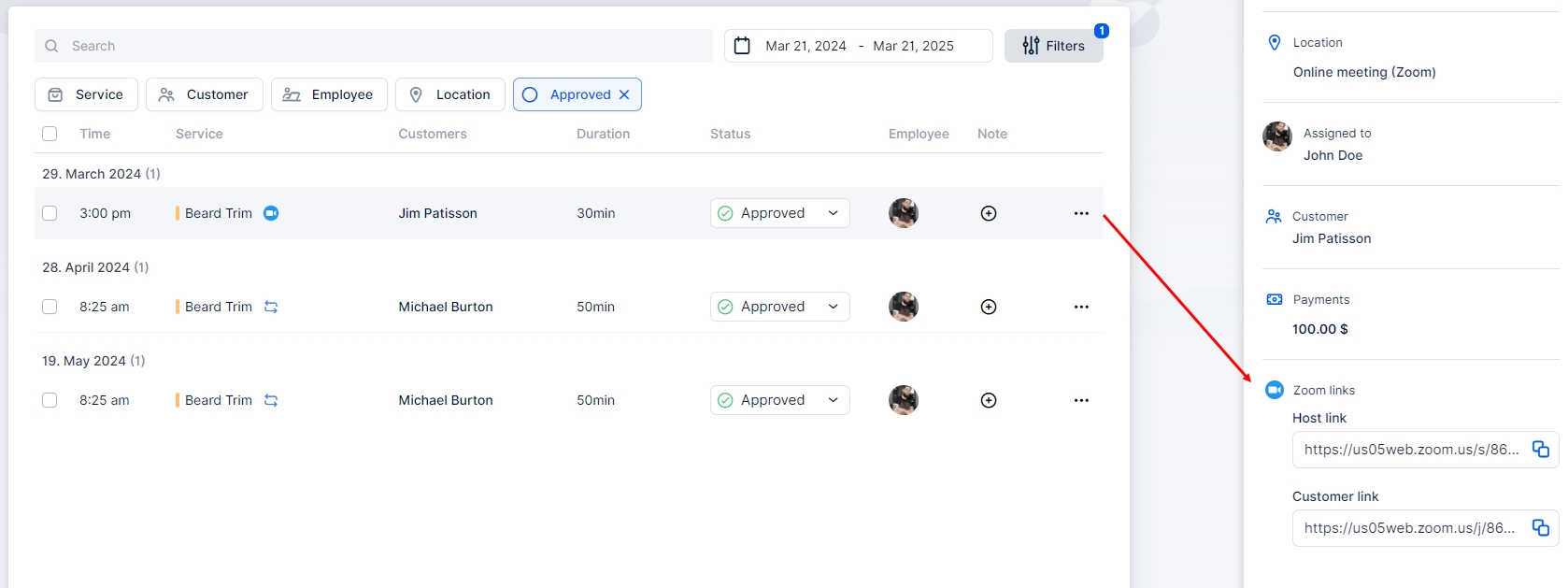 In addition to sending the Zoom link in notifications, you can also access it within the appointment details. On the Appointments page, you can easily distinguish between online and offline appointments by looking at the list. Online appointments will have a camera icon next to the service name. Simply click on the appointment with the camera icon, and in the appointment details, you’ll find both the Host and Join links readily available for easy access.