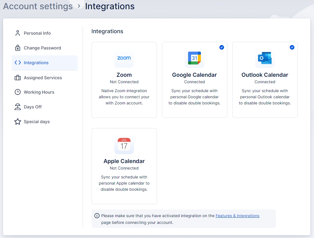 This will open a new window where the logged-in employee can update their personal information, change their password, and manage their schedule (if their user role allows). Most importantly for this integration, they can access the Integrations section and log into their personal Zoom account.